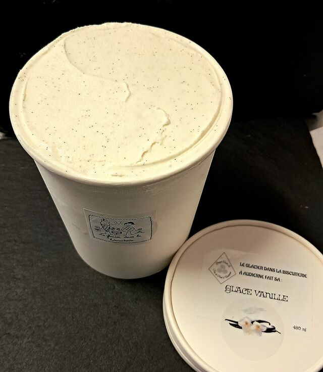 BÛCHE VANILLE/CARAMEL: glace vanille avec un cœur de glace au caramel beurre salé posée sur une génoise vanillée et un croustillant au chocolat blanc et caramel avec quelques zestes de citron.