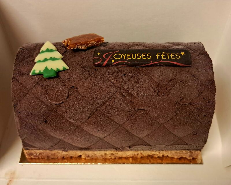 BÛCHE CHOCOLAT LAIT/PASSION : glace au chocolat au lait avec un cœur sorbet fruits de la passion posée sur une génoise et un croustillant praliné-fève de Tonka.